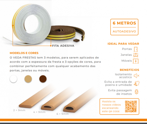 O Veda Frestas é um perfil de borracha auto adesivo, projetado para realizar vedações de frestas em batentes de portas, janelas, esquadrias, armários, entre outros, com rapidez e praticidade.